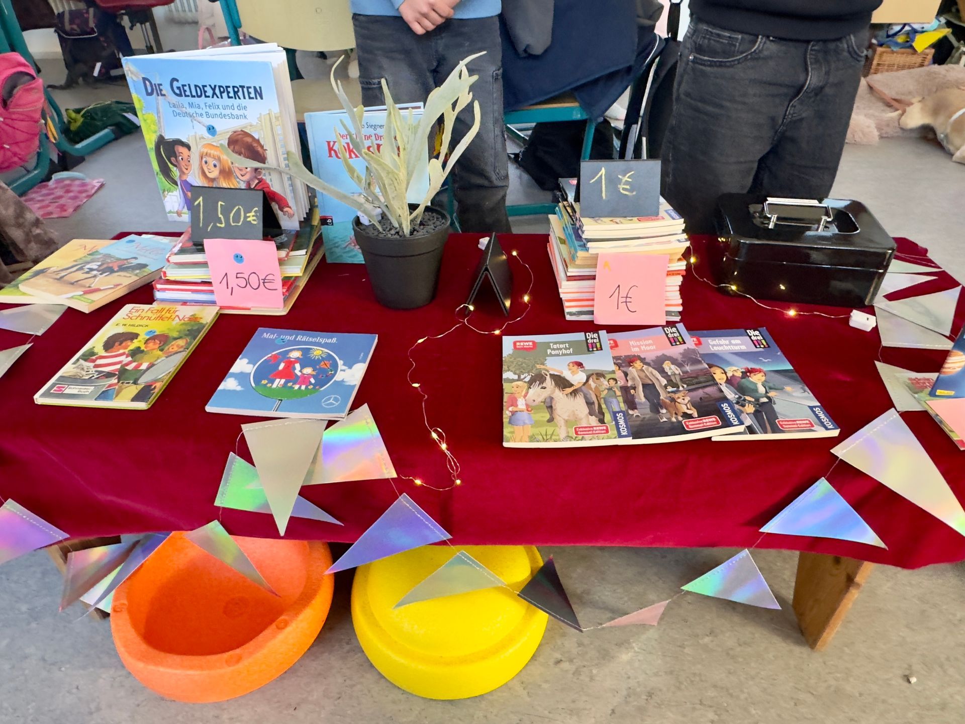 Mindestens genauso aufregend war der Bücherflohmarkt in den Klassen. Dort wurde gestöbert, gehandelt und entdeckt, bis die Tische leergekauft waren. Am Ende freuten sich alle: Die Kinder über neue Lieblingsbücher und die Klassen über einen vollen Erlös für ihre Klassenkassen.